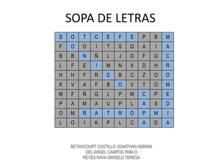 This document contains a word search puzzle with letters arranged in a grid and three names hidden among the letters: BETANCOURT CASTILLO JONATHAN ADRIAN, DEL ANGEL CAMPOS PABLO, and REYES RAYA GRISELD TERESA. Players must scan the grid to find and identify the hidden names.
