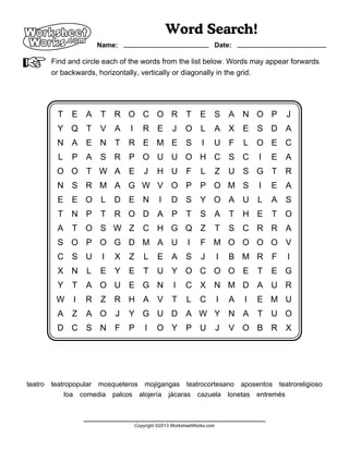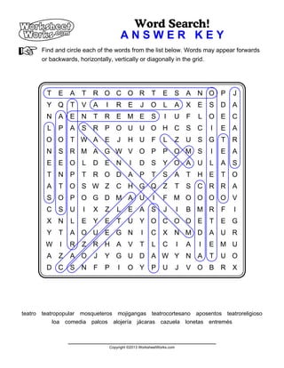 The document provides a word search puzzle containing words related to Spanish theater such as "teatro", "teatropopular", "mosqueteros", and "comedia". Players are instructed to find and circle the words from the given list that appear forwards, backwards, horizontally, vertically, or diagonally within the letter grid.
