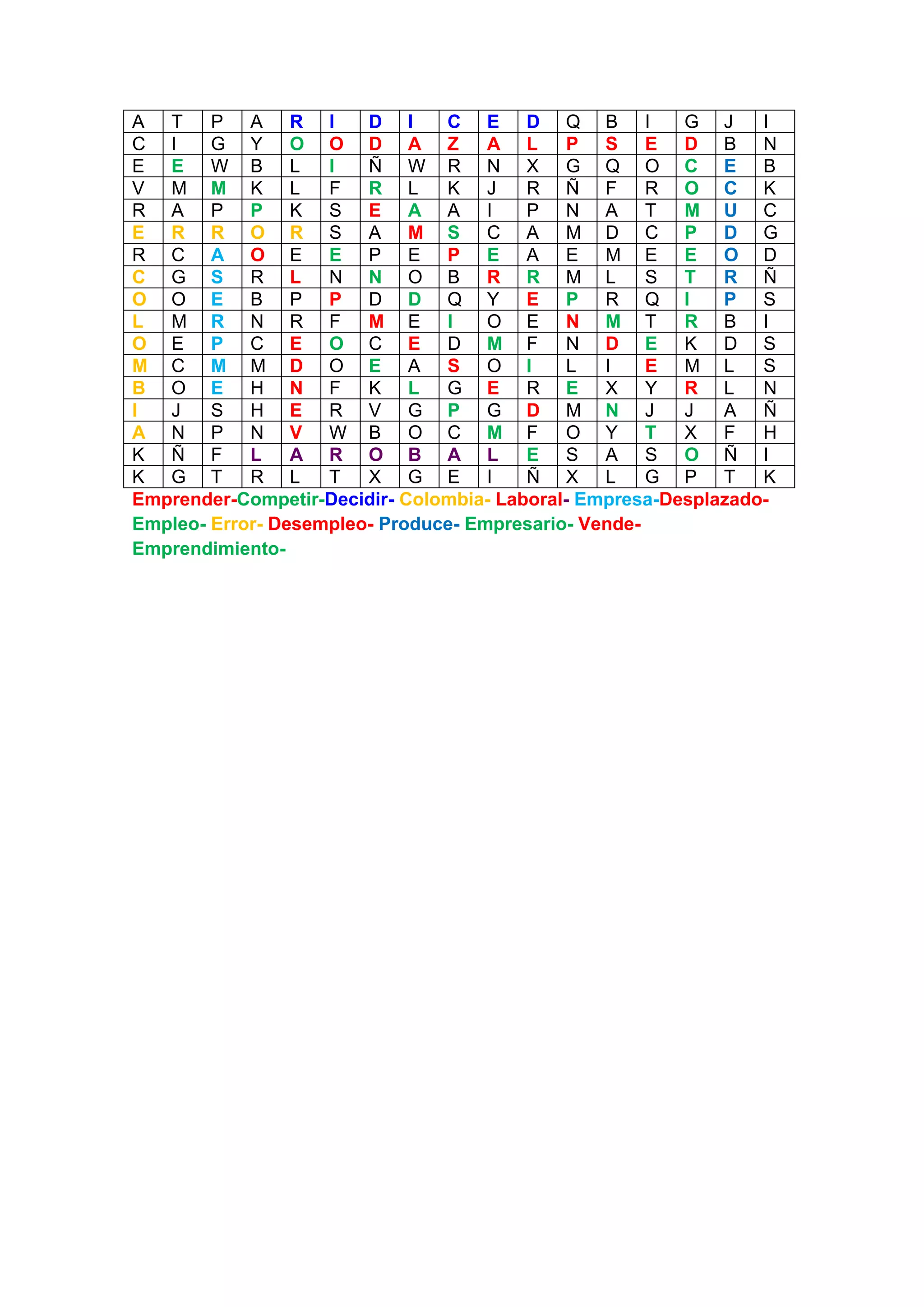 The document contains a series of Spanish words and letters with no clear meaning. It discusses various topics related to work, business, and employment in Colombia such as emprender (to undertake), competir (to compete), decidir (to decide), Colombia, laboral (labor), empresa (company), desplazado (displaced person), empleo (employment), error, desempleo (unemployment), produce, empresario (entrepreneur), vende (sells).