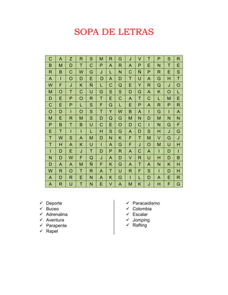 This document contains a word search puzzle with Spanish words related to sports and adventure activities hidden throughout. Some of the words included are deporte (sport), buceo (scuba diving), adrenalina (adrenaline), aventura (adventure), parapente (paragliding), rapel (rappelling), paracaidismo (skydiving), Colombia, escalar (climbing), jomping (bungee jumping), and rafting.