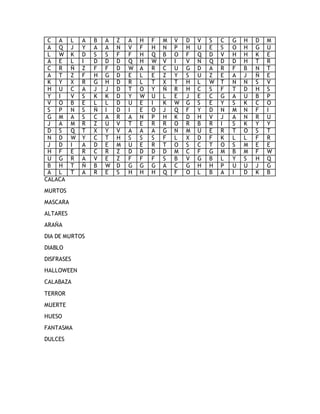 This document contains Spanish words related to Halloween and Día de Muertos, including CALACA, MURTOS, MASCARA, ALTARES, ARAÑA, DIA DE MURTOS, DIABLO, DISFRASES, HALLOWEEN, CALABAZA, TERROR, MUERTE, HUESO, FANTASMA, and DULCES.