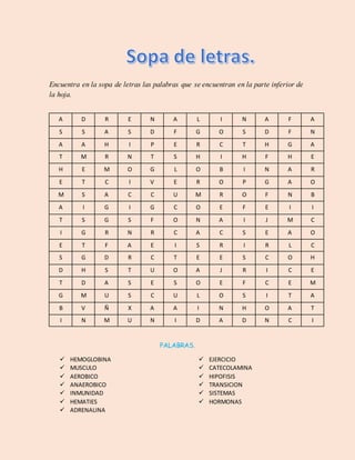 The document contains a word search puzzle with words related to biology hidden within. The words to find are listed at the bottom and include terms like hemoglobin, muscle, aerobic, anaerobic, immunity, red blood cells, adrenaline, exercise, catecholamine, pituitary gland, transition, systems, and hormones.