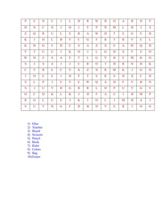 The document contains a grid of letters that spells out school supplies in rows from top to bottom. It lists 10 common school supplies: pencil, glue, teacher, board, scissors, pencil, book, ruler, colors, and eraser.