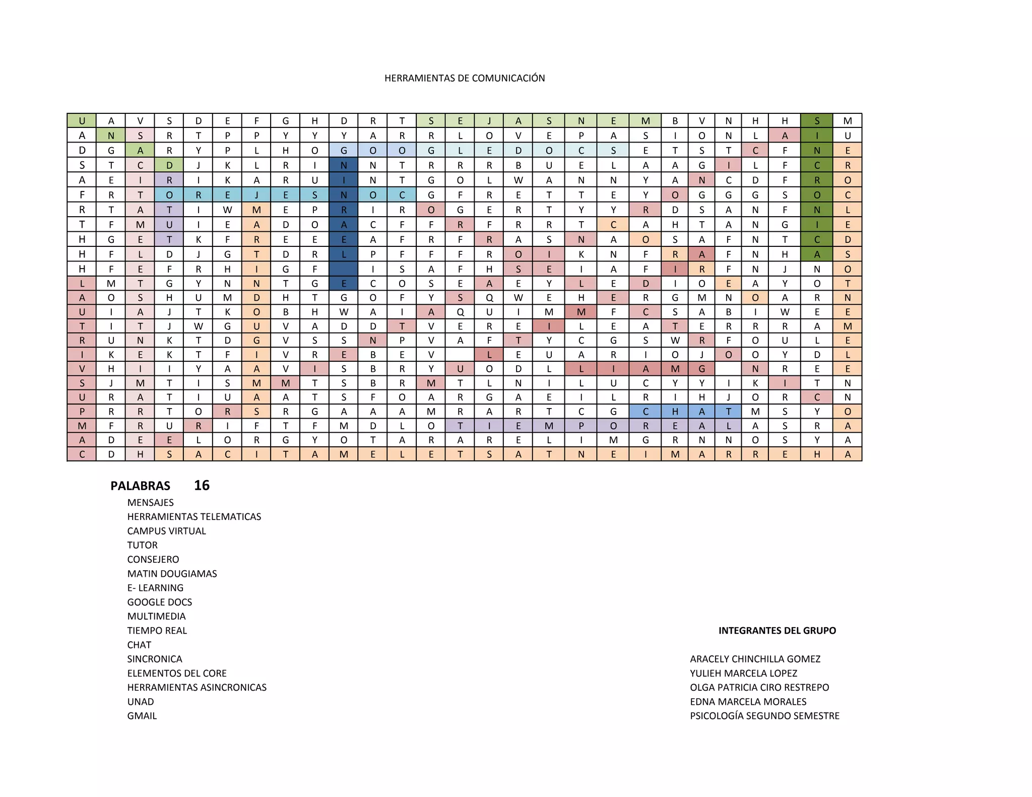 The document discusses communication tools for distance learning, listing various online tools and platforms. It mentions tools like virtual campus, tutor, advisor, e-learning, Google Docs, multimedia, chat, synchronous tools, asynchronous tools, and specific platforms like UNAD and Gmail. It also lists the names of group members for a psychology course.