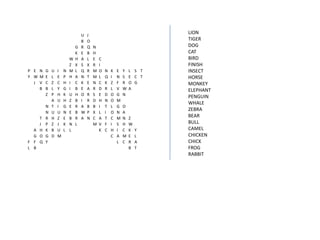 The document contains a grid of letters that spells out different animal names vertically, horizontally, and diagonally. Some of the animals named in the grid include lion, tiger, dog, cat, bird, whale, zebra, bear, monkey, elephant, horse, penguin, and insect.