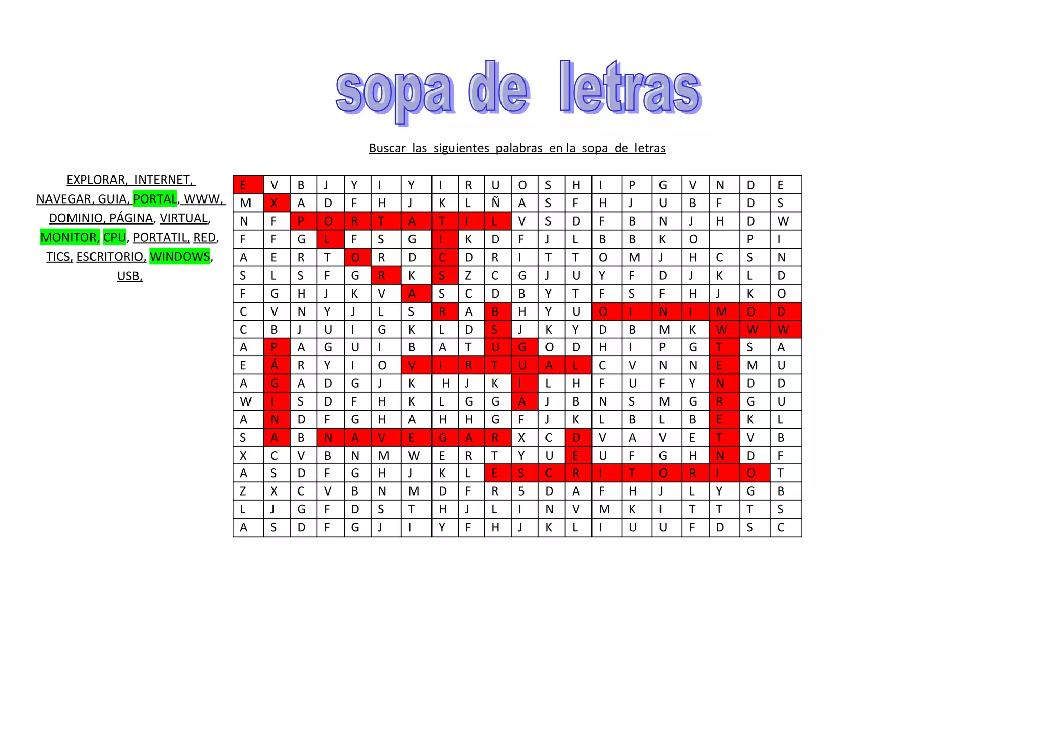 The document is a word search puzzle containing the following Spanish words related to computers and the internet: EXPLORAR (explore), INTERNET, NAVEGAR (browse), GUIA (guide), PORTAL, WWW, DOMINIO (domain), PÁGINA (page), VIRTUAL, MONITOR, CPU, PORTATIL (laptop), RED (network), TICS, ESCRITORIO (desktop), WINDOWS, USB, WISD (Windows), AGADE (Windows), PAGINA (page), VIRTUAL, DOMINIO (domain), WWW, GUIA (guide), NAVEGAR (browse), EXPLORAR (explore