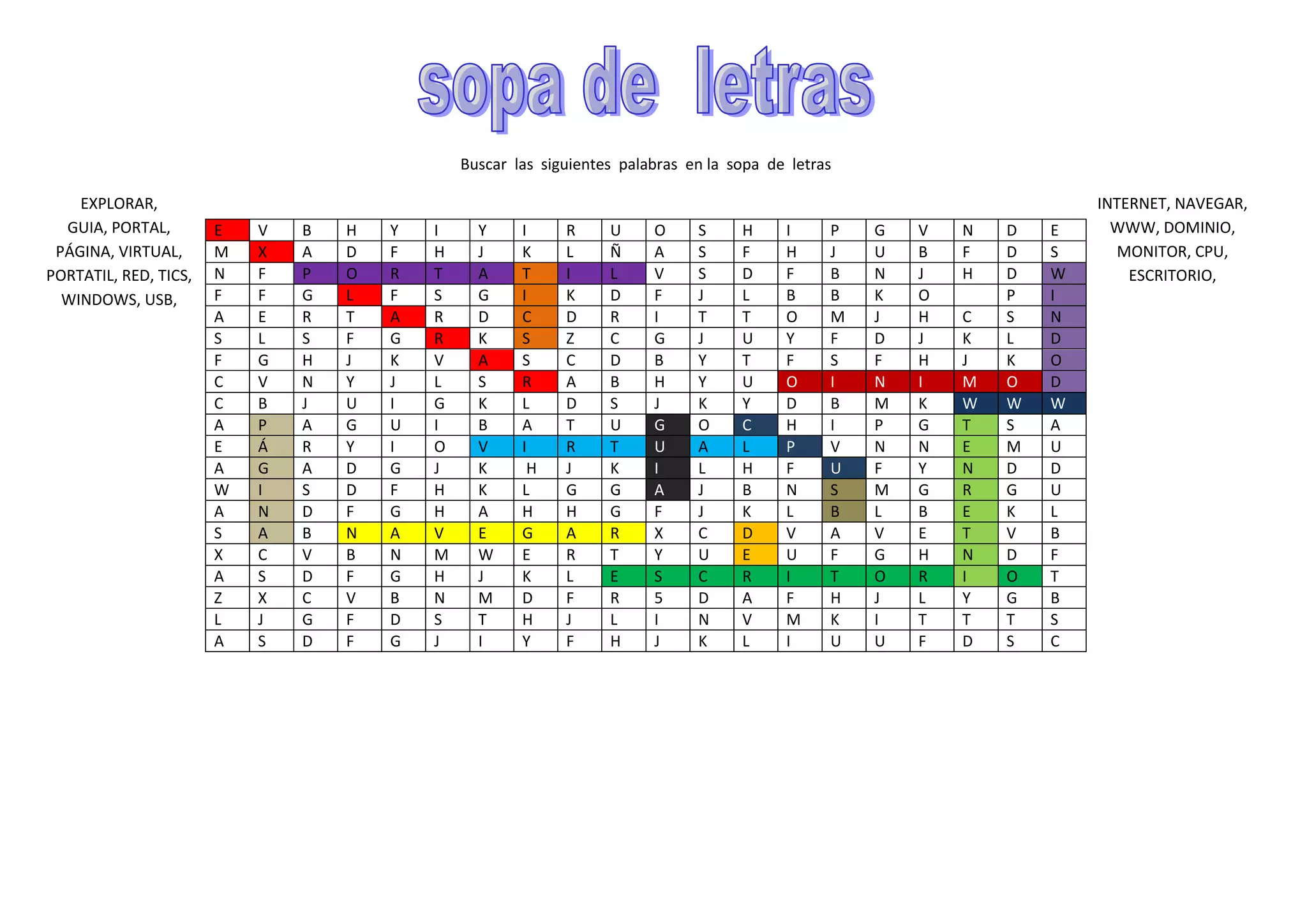 The document is a word search puzzle containing terms related to computers and the internet. Some of the terms to search for include "EXPLORAR" (explore), "INTERNET", "NAVEGAR" (browse), "GUIA" (guide), "PORTAL", "WWW", "DOMINIO" (domain), "PÁGINA" (page), "VIRTUAL", "MONITOR", "CPU", "PORTATIL" (laptop), "RED" (network), "TICS", "ESCRITORIO" (desktop), "WINDOWS", "USB".