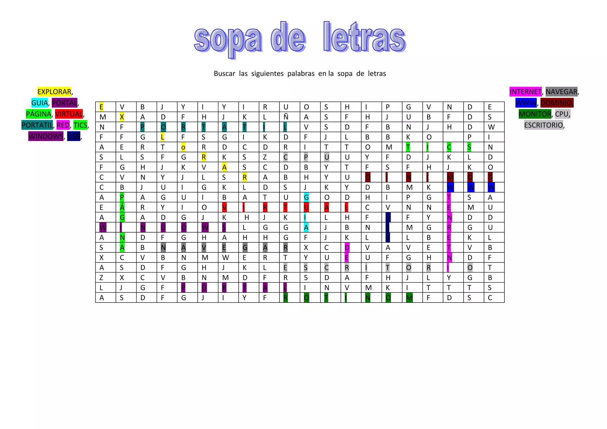 The document is a word search puzzle containing IT-related terms like "internet", "website", "computer", and "laptop" to find. It provides a grid of letters within which are hidden multiple words listed at the top that are key parts of researching information online and using digital technology.