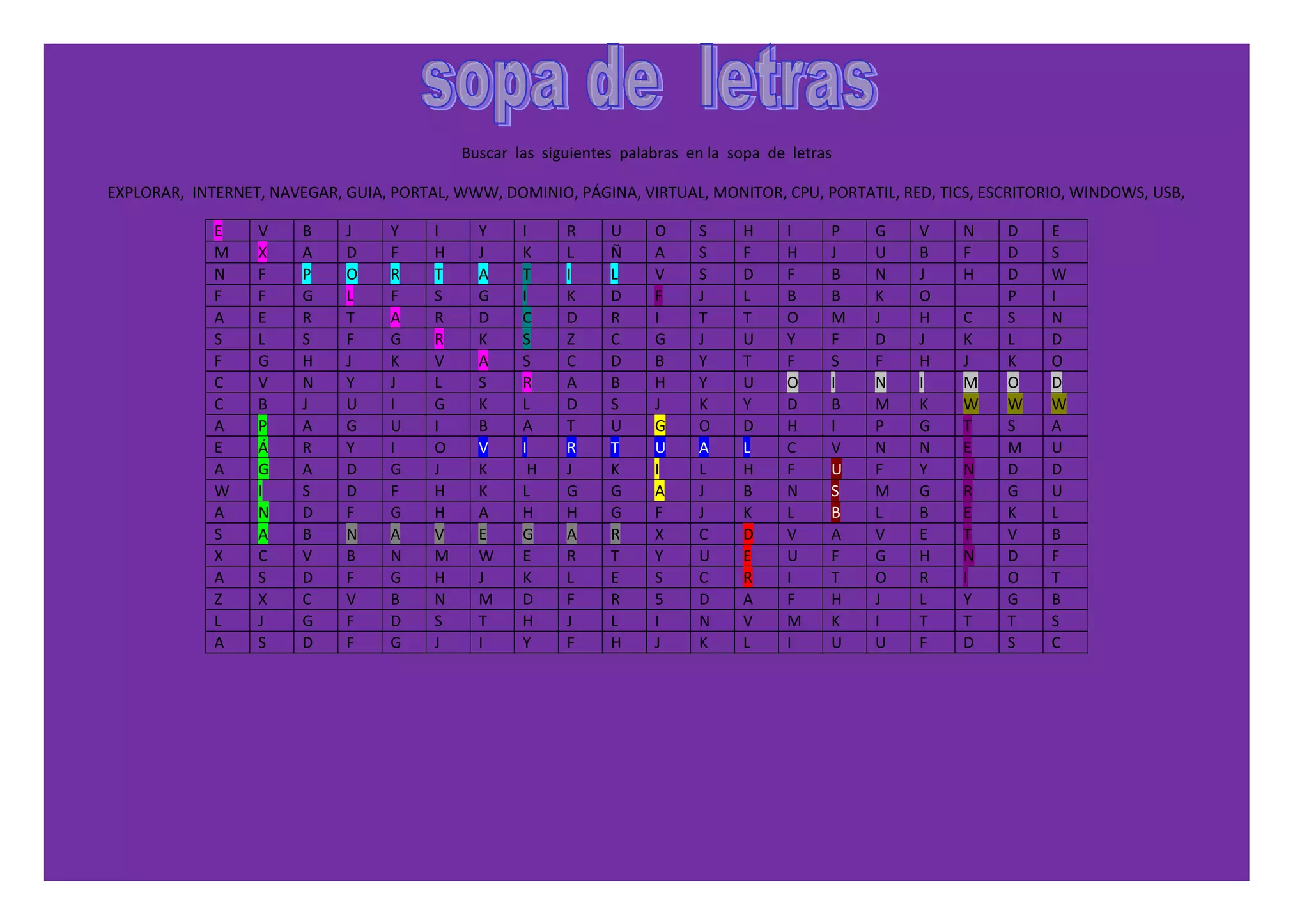 Buscar las siguientespalabras en la sopa de letras EXPLORAR, INTERNET, NAVEGAR, GUIA, PORTAL, WWW, DOMINIO, PÁGINA, VIRTUAL, MONITOR, CPU, PORTATIL, RED, TICS, ESCRITORIO, WINDOWS, USB, E V B J Y I Y I R U O S H I P G V N D E M X A D F H J K L Ñ A S F H J U B F D S N F P O R T A T I L V S D F B N J H D W F F G L F S G I K D F J L B B K O P I A E R T A R D C D R I T T O M J H C S N S L S F G R K S Z C G J U Y F D J K L D F G H J K V A S C D B Y T F S F H J K O C V N Y J L S R A B H Y U O I N I M O D C B J U I G K L D S J K Y D B M K W W W A P A G U I B A T U G O D H I P G T S A E Á R Y I O V I R T U A L C V N N E M U A G A D G J K H J K I L H F U F Y N D D W I S D F H K L G G A J B N S M G R G U A N D F G H A H H G F J K L B L B E K L S A B N A V E G A R X C D V A V E T V B X C V B N M W E R T Y U E U F G H N D F A S D F G H J K L E S C R I T O R I O T Z X C V B N M D F R 5 D A F H J L Y G B L J G F D S T H J L I N V M K I T T T S A S D F G J I Y F H J K L I U U F D S C