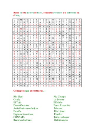The document contains a grid of letters that contains concepts related to what was published on a blog. It then lists concepts that could be found, including names of rivers in Chile (Río Elqui, Río Choapa), cities (Ovalle, La Serena, El Tofo, El Molle), issues like desertification, extractive fishing, economic activities, poverty, erosion, mining exploitation, employment, environmental organizations (CONAMA), water resources, and urban tribes and crime.