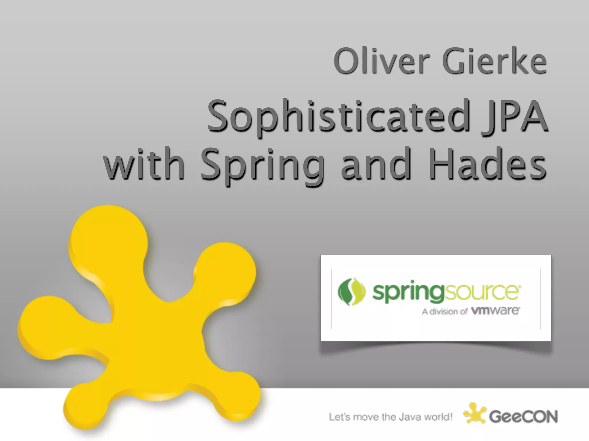 This document introduces Oliver Gierke, a senior consultant at SpringSource who will be giving a presentation on Hades, an open source Java persistence framework that provides sophisticated JPA functionality when used with Spring. It provides Oliver's contact information and links to the Hades website and GitHub repository for further information.