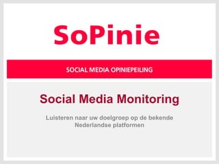 Waarmee kan ikluisteren?U kunt uw analyses doen doormiddel van SoPinie.SoPinie is een Nederlandstalige tool voor het meten van opinie op de diverse sociale mediaSoPinie is een samenwerking tussen Communicatiebureau Imagro BV Markt- en Opinieonderzoeksbureau Team Vier