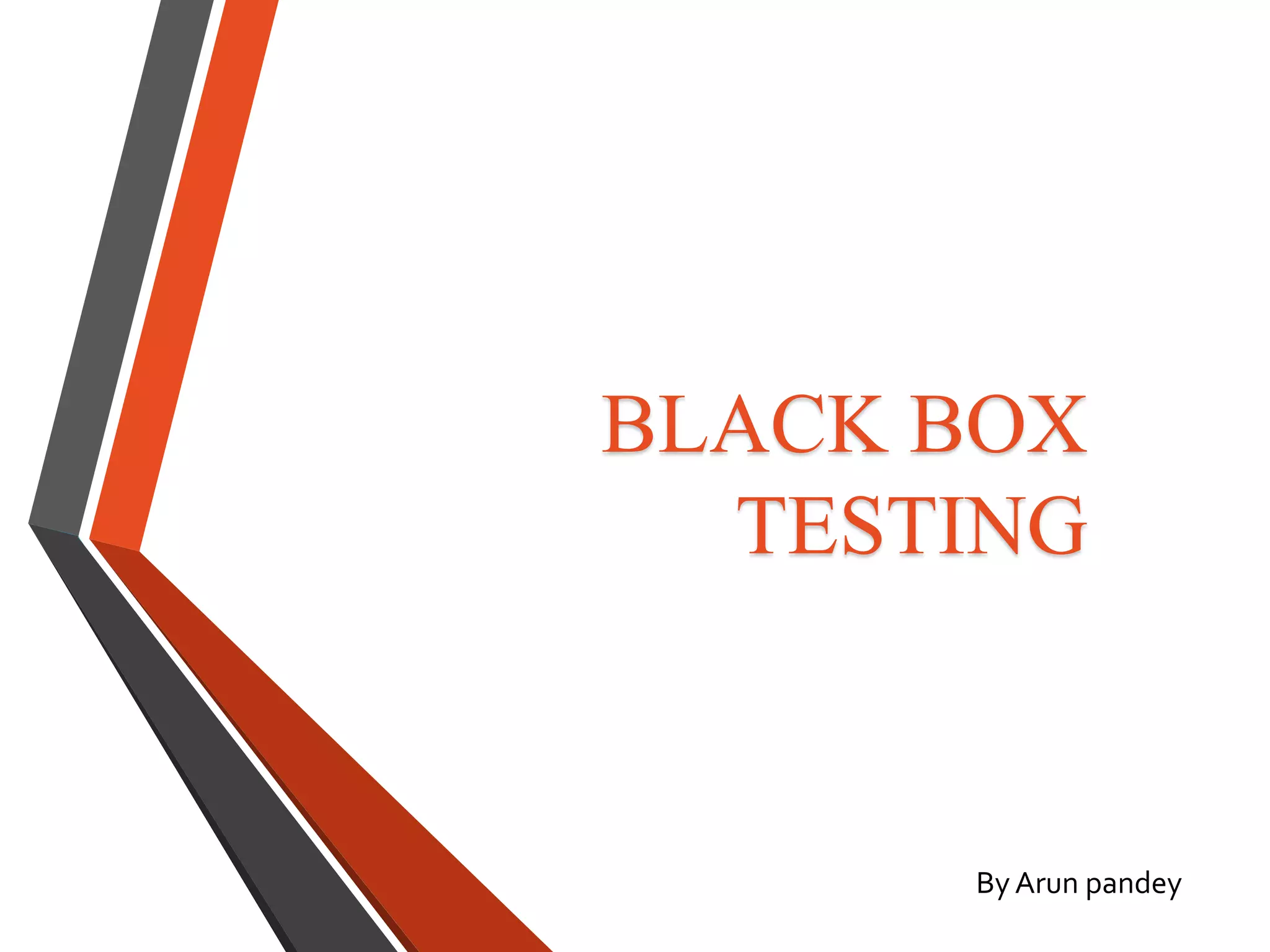 Black-box testing examines software functionality without knowledge of internal structures. It aims to find errors in functions, interfaces, data access, behavior, and initialization/termination. Black-box testing can be used at all testing levels and is most useful for larger systems. It has advantages of testing from a user perspective but limitations of only testing a small number of inputs.