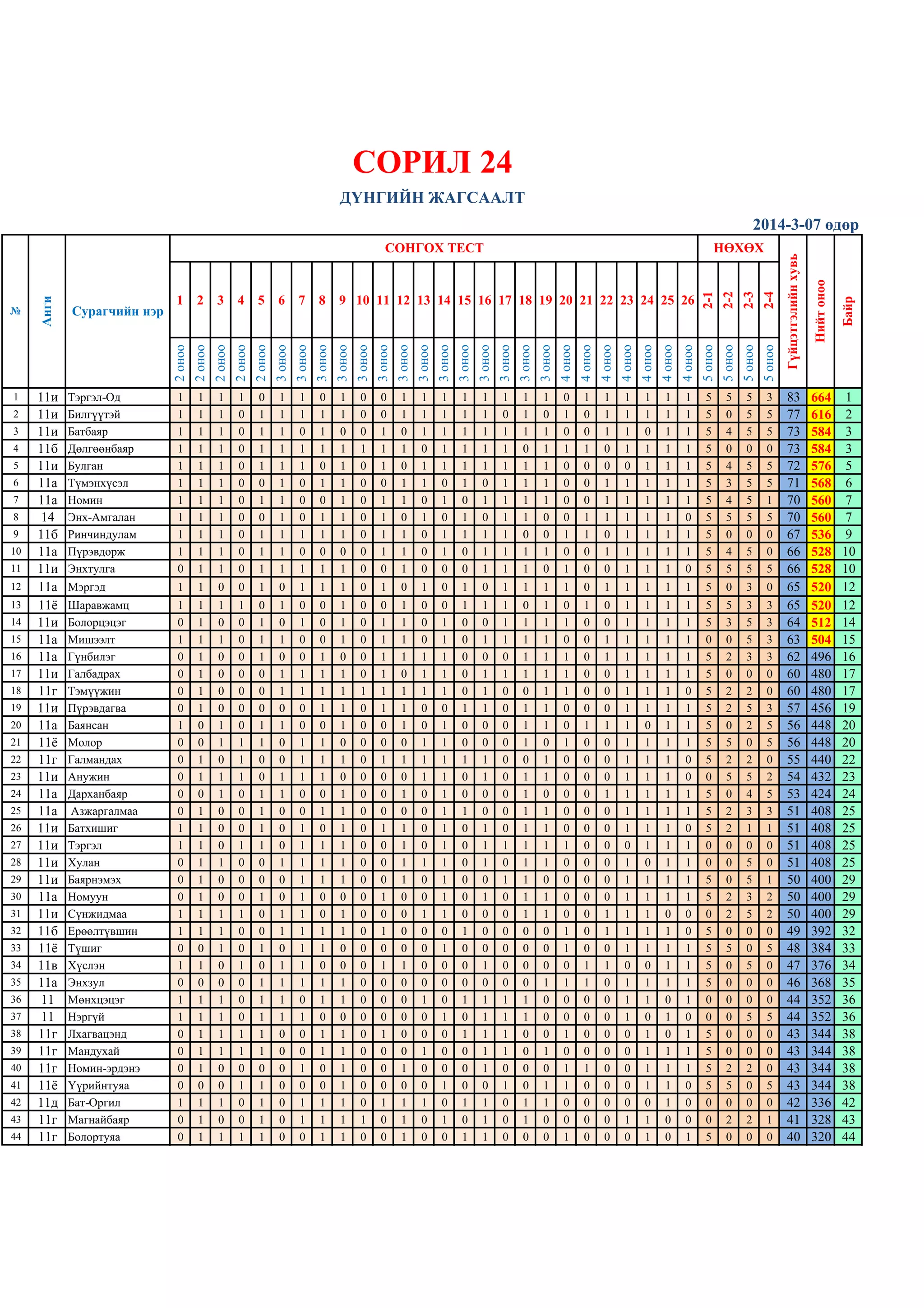 10 11 12 13 14 15 16 17 18 19 20 21 22 23 24 25 26 Байр 35 Тэргэл-Од Билгүүтэй Батбаяр Дөлгөөнбаяр Булган Түмэнхүсэл Номин Энх-Амгалан Ринчиндулам Пүрэвдорж Энхтулга Сурагчийн нэр Нийт оноо 34 2-4 33 2-3 32 5 оноо 31 5 оноо 30 2-2 29 2-1 28 5 оноо 27 5 оноо 26 4 оноо 25 4 оноо 24 4 оноо 23 4 оноо 22 4 оноо 21 4 оноо 20 4 оноо 19 3 оноо 18 3 оноо 17 3 оноо 16 3 оноо 15 3 оноо 14 3 оноо 13 3 оноо 12 3 оноо 11 3 оноо 9 10 3 оноо 8 3 оноо 7 3 оноо 6 3 оноо 5 3 оноо 4 2 оноо 3 11и 11и 11и 11б 11и 11а 11а 14 11б 11а 11и 11а 11ё 11и 11а 11a 11и 11г 11и 11а 11ё 11г 11и 11а 11а 11и 11и 11и 11и 11а 11и 11б 11ё 11в 11а 11 11 11г 11г 11г 11ё 11д 11г 11г 2 оноо 2 2 оноо 1 Анги № 2 оноо НӨХӨХ 2 оноо СОНГОХ ТЕСТ Гүйцэтгэлийн хувь 2014-3-07 өдөр 83 77 73 73 72 71 70 70 67 66 66 65 65 64 63 62 60 60 57 56 56 55 54 53 51 51 51 51 50 50 50 49 48 47 46 44 44 43 43 43 43 42 41 40 664 616 584 584 576 568 560 560 536 528 528 520 520 512 504 496 480 480 456 448 448 440 432 424 408 408 408 408 400 400 400 392 384 376 368 352 352 344 344 344 344 336 328 320 1 2 3 3 5 6 7 7 9 10 10 12 12 14 15 16 17 17 19 20 20 22 23 24 25 25 25 25 29 29 29 32 33 34 35 36 36 38 38 38 38 42 43 44