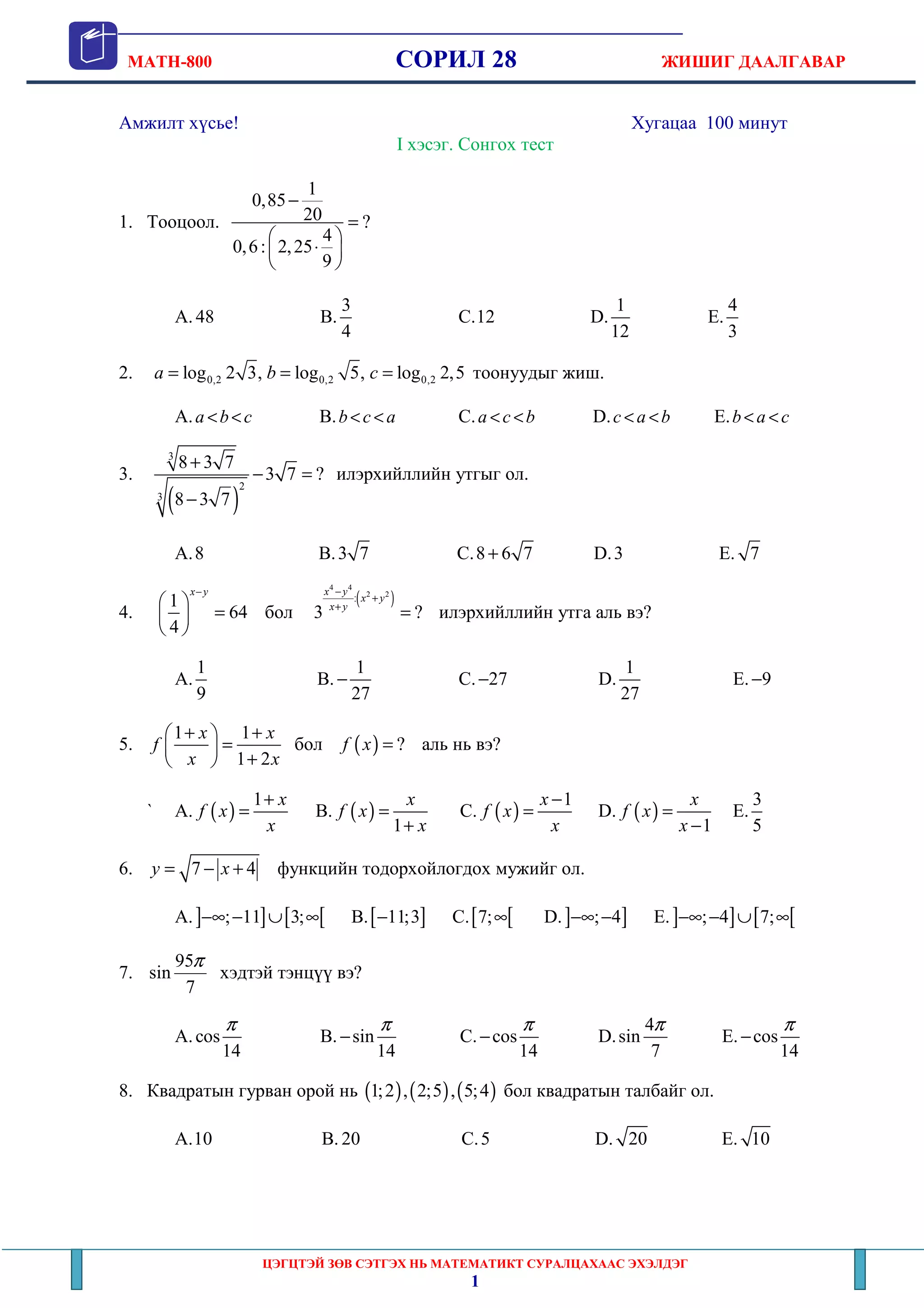 MATH-800 СОРИЛ 28ЖИШИГ ДААЛГАВАР
