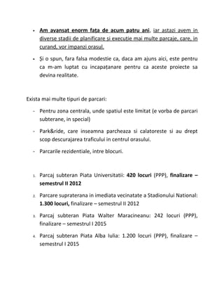 Platforma program pentru București își propune să dezvolte Capitala printr-o strategie unitară pe termen lung, concentrându-se pe crearea unui sistem modern de parcări și revitalizarea centrului orașului. Proiectele includ parcări subterane și supraterane, reabilitarea infrastructurii istorice și crearea unor 'camere urbane' dedicate diferitelor activități culturale. De asemenea, se vizează îmbunătățirea calității vieții, atragerea investitorilor și sprijinirea dezvoltării cartierelor printr-o viziune integrată și acțiuni coordonate.