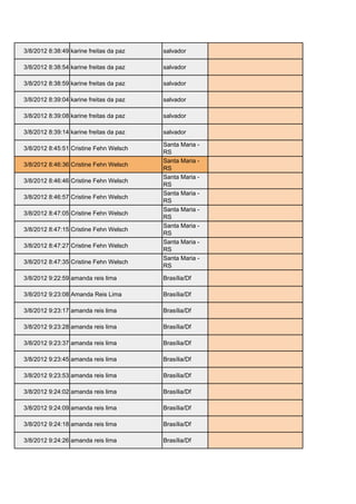 The document contains a log of timestamped entries recording people's names, cities, and email addresses. It logs multiple entries for several individuals on March 8, 2012, including Karine Freitas da Paz in Salvador, Brazil; Cristine Fehn Welsch in Santa Maria, Brazil; Amanda Reis Lima in Brasília, Brazil; and Thais Monteiro Silva in Rio de Janeiro, Brazil. The entries suggest it is tracking sign-ins or logins to an online system by these various users on that date.
