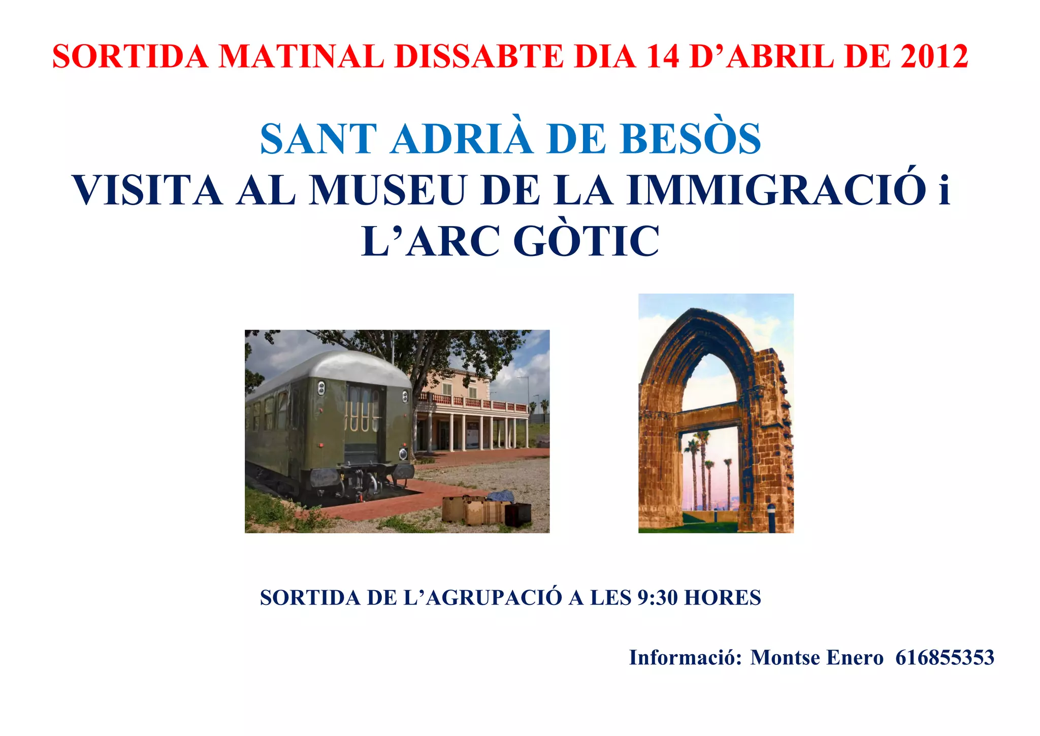 DIA 14 D’ABRIL DE 2012 SANT ADRIÀ DE BESÒS VISITA AL MUSEU DE LA IMMIGRACIÓ i L’ARC GÒTIC SORTIDA DE L’AGRUPACIÓ A LES 9:30 HORES Informació: Montse Enero 616855353