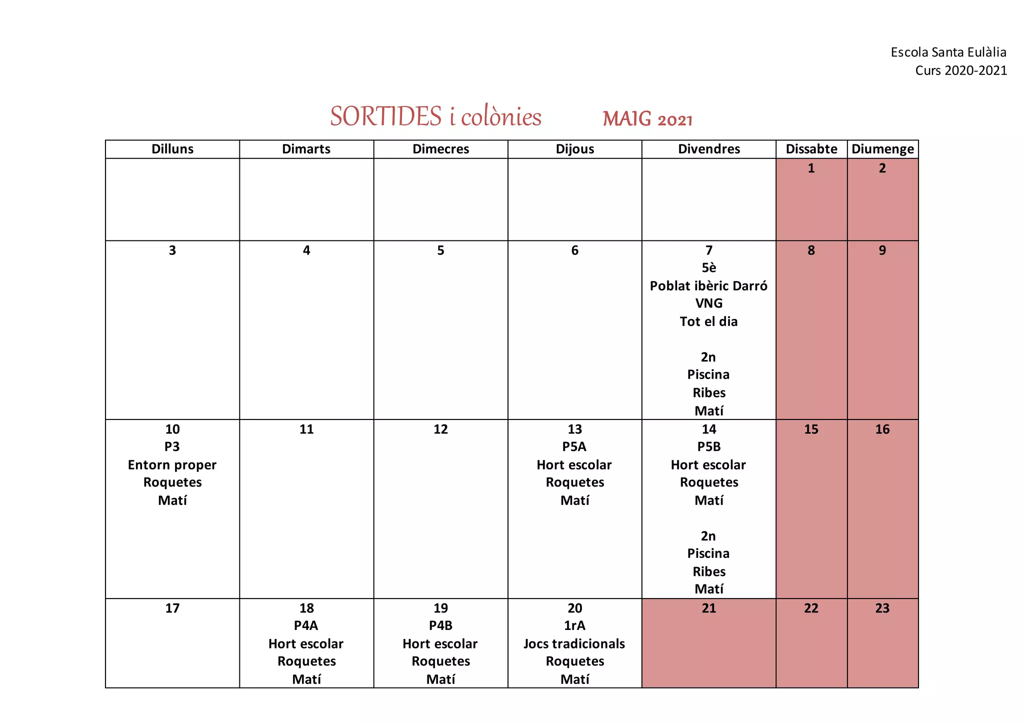 SORTIDES i colònies MAIG 2021