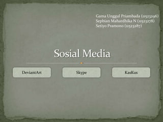 Dokumen ini membahas tentang tiga platform, yaitu DeviantArt, Skype, dan Kaskus. DeviantArt adalah situs seni untuk berbagi dan menjual karya, Skype merupakan program komunikasi suara berbasis internet, dan Kaskus adalah forum komunitas maya terbesar di Indonesia. Setiap platform memiliki kelebihan dan kelemahan yang terkait dengan penggunaannya.