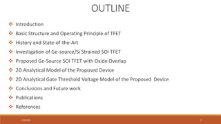 The document discusses a presentation given by Ashish Kumar Singh on his research investigating heterojunction silicon-on-insulator tunnel field effect transistors. The presentation outline includes an introduction discussing challenges with MOSFET scaling, the history and state-of-the-art of TFET research, the basic structure and operation of TFETs, investigations of Ge-source/Si strained SOI TFETs, a proposed Ge-source SOI TFET with oxide overlap, analytical modeling of the proposed device, conclusions and future work.