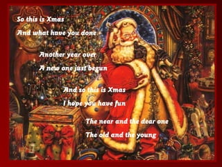Celine Dion sings about Christmas and the holidays. She reflects on the past year coming to an end and a new year beginning. She hopes that Christmas is fun and enjoyable for those near and dear, young and old. She expresses a wish for a very merry Christmas and happy new year without fear, and hopes for peace for all people regardless of race, wealth, or beliefs.