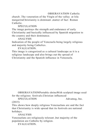 The document provides a comprehensive overview of Venezuela's cultural, linguistic, and demographic landscape, highlighting its diverse population, predominantly Roman Catholic religious adherence, and various ethnic groups. It emphasizes the significance of cultural landscapes that reflect indigenous and religious practices, as well as ongoing challenges related to urbanization and economic dependence on oil. Additionally, the document discusses the country's geography, population statistics, and the implications of its demographic transition on future socio-economic development.