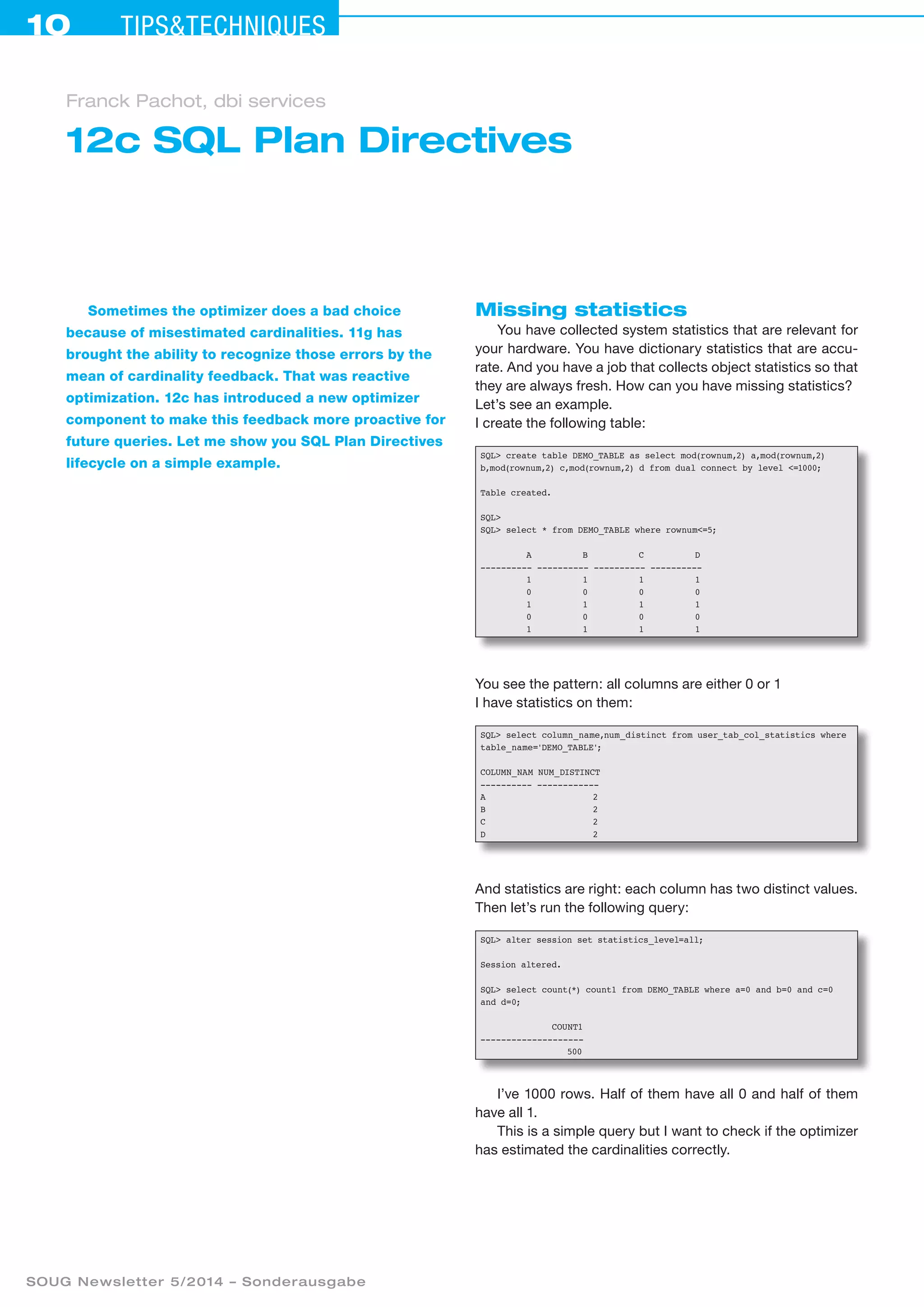 The document summarizes how SQL Plan Directives in Oracle 12c can help address issues caused by cardinality misestimation in the optimizer. It provides an example where the optimizer underestimates the number of rows returned by a query on a table due to not having statistics on correlated columns. In 12c, a SQL Plan Directive is automatically generated after the first execution to capture this misestimation. On subsequent queries, the directive can be used to provide more accurate cardinality estimates through automatic reoptimization or dynamic sampling.