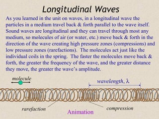 Sound waves are longitudinal waves that propagate through a medium by causing oscillations in pressure. The speed of sound depends on properties of the medium like density and bulk modulus. Frequency determines pitch, with the human hearing range from 20-20,000 Hz. The Doppler effect causes changes in observed frequency due to relative motion between source and receiver. Sonar uses echoes to locate objects by sound, while sonic booms occur when the source moves at or faster than the speed of sound.