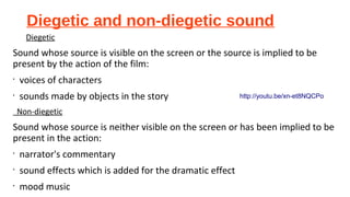 The document discusses various types of sound that can be used in films, including diegetic sound whose source is visible or implied, versus non-diegetic sound whose source is neither. It also covers synchronous sound that is matched to the visuals versus asynchronous sound that provides mood. Additionally, it defines voiceovers, flashbacks, sound perspective, bridges, nonsimultaneous sound, direct sound, sound effects, motifs, dialogue, incidental music, themes and stings, and ambient sounds.