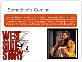 West Side Story is a 1950s musical based on Romeo and Juliet, about rival New York City gangs, the Jets and Sharks. Tony, a Jet, falls for Maria from the Sharks. The song "Something's Coming" uses a musical technique called a triton to ominously foreshadow trouble for Tony, clearly communicating this to the audience. Bill Fontana recorded pigeon sounds in church ruins and played them back through speakers in the same spot, now a museum, creating a time displacement illusion of pigeons still present. While both use found sounds, the musical aims to entertain without requiring thought, whereas Fontana's installation means to evoke self-guided interpretation.
