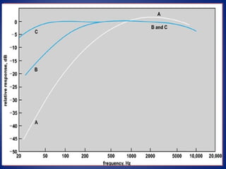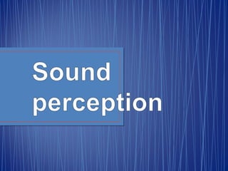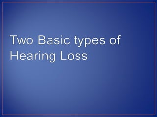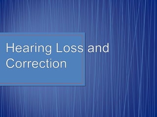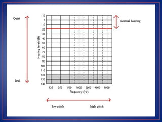 The document summarizes the anatomy and physiology of the human ear, how sound is detected and transmitted through the ear, and how we perceive qualities of sound like loudness and pitch. It also discusses different types of hearing loss and methods for testing hearing thresholds.