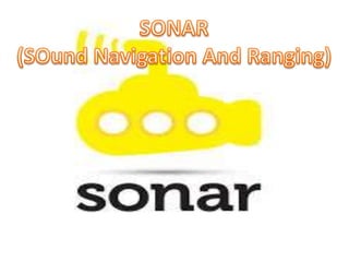 Sound is produced by vibration and travels as longitudinal waves through a medium, causing successive compressions and rarefactions. Sonar uses ultrasonic waves to measure underwater objects by transmitting waves from a device, detecting the waves after they reflect off objects, and calculating distances based on sound speed and transmission/reception times. Sonar consists of a transmitter and detector installed on boats to help navigate.