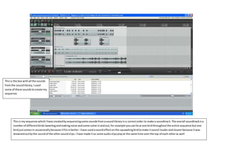 This document summarizes the steps taken to render a sound sequence file. The creator rendered individual sound clips into a single file, keeping the sample rate the same to maintain frequency. The file was saved as a WAV format and included different bird sounds tweeting and noises, with some birds coming in and out occasionally and one bird playing throughout. Effects were added to make one squawking bird louder to be heard over other clips.