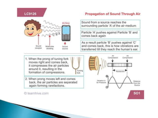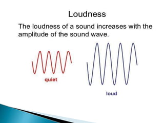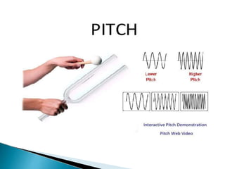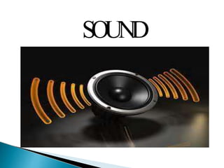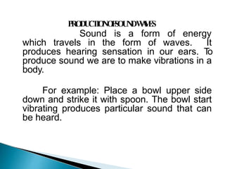 Sound is a form of energy that travels in waves and produces hearing sensations. It is produced when a body vibrates, such as when a tuning fork is struck. Sound waves need a medium like air, water or other materials to propagate. They are longitudinal waves that cause compressions and rarefactions as they travel. The pitch and frequency of a sound are directly related, with a higher frequency producing a higher pitch. Loudness depends on factors like the amplitude and area of the vibrating body as well as the distance from the source. Ultrasound has a frequency above the human audible range and is used for applications like medical imaging and cleaning.