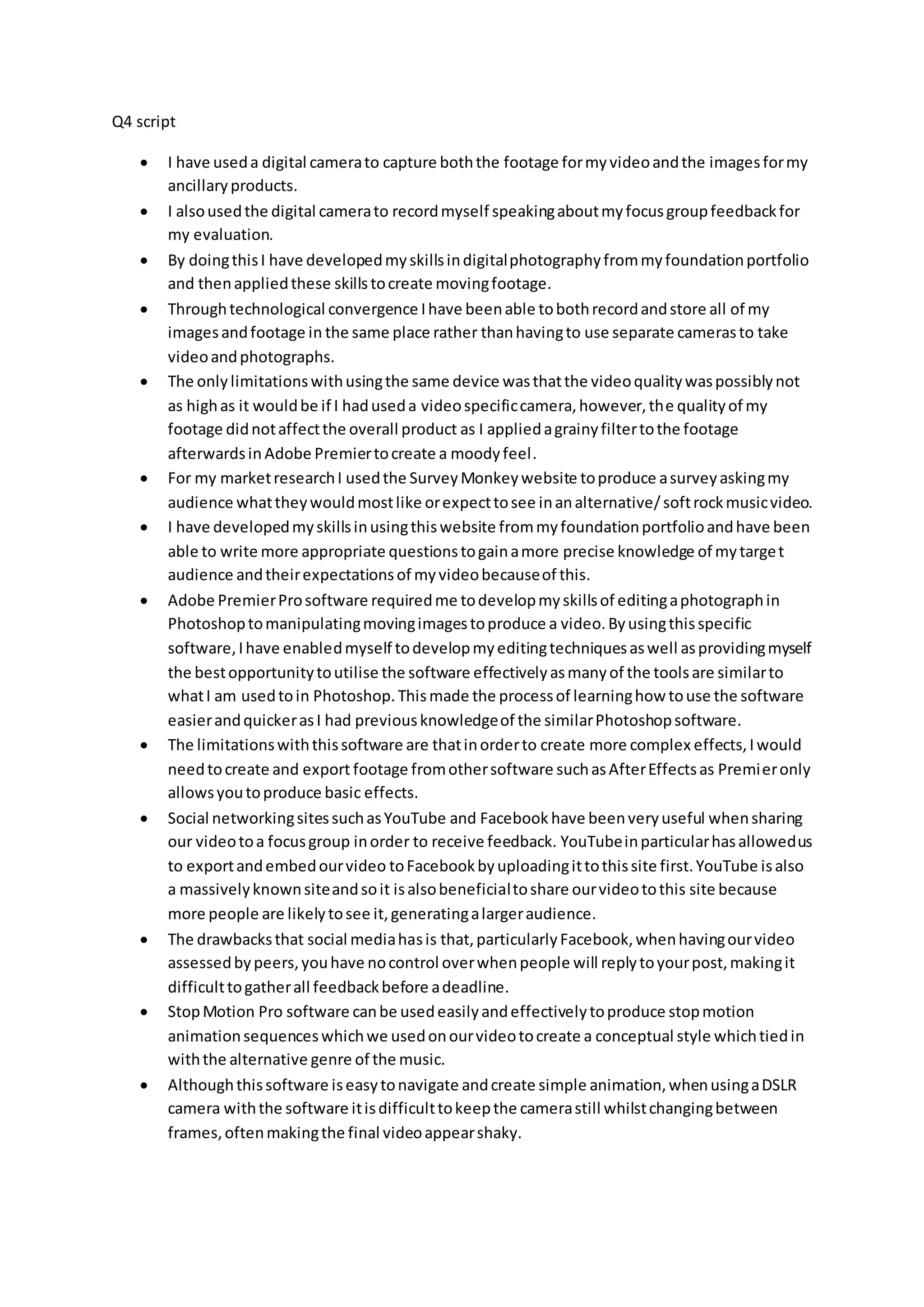 The document discusses the tools and software used to create a music video, including a digital camera to capture footage and images, Adobe Premiere Pro to edit the video, SurveyMonkey for market research, and social media sites like YouTube and Facebook to share and get feedback on the video. It also mentions using StopMotion Pro software to create stop-motion animation sequences for the video. Limitations discussed include video quality not being as high with a single device rather than separate cameras, and Premiere Pro only allowing basic effects without other software.