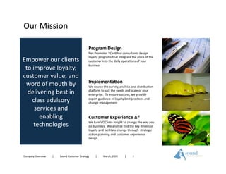 Sound Customer Strategy is a consulting firm that helps clients build operational loyalty programs. They design loyalty programs using Net Promoter methodology to integrate customer feedback. They implement surveys to collect voice of customer data and provide an online platform for analysis. Consultants work with clients to identify drivers of loyalty, address issues, and develop action plans to improve the customer experience and loyalty over time.