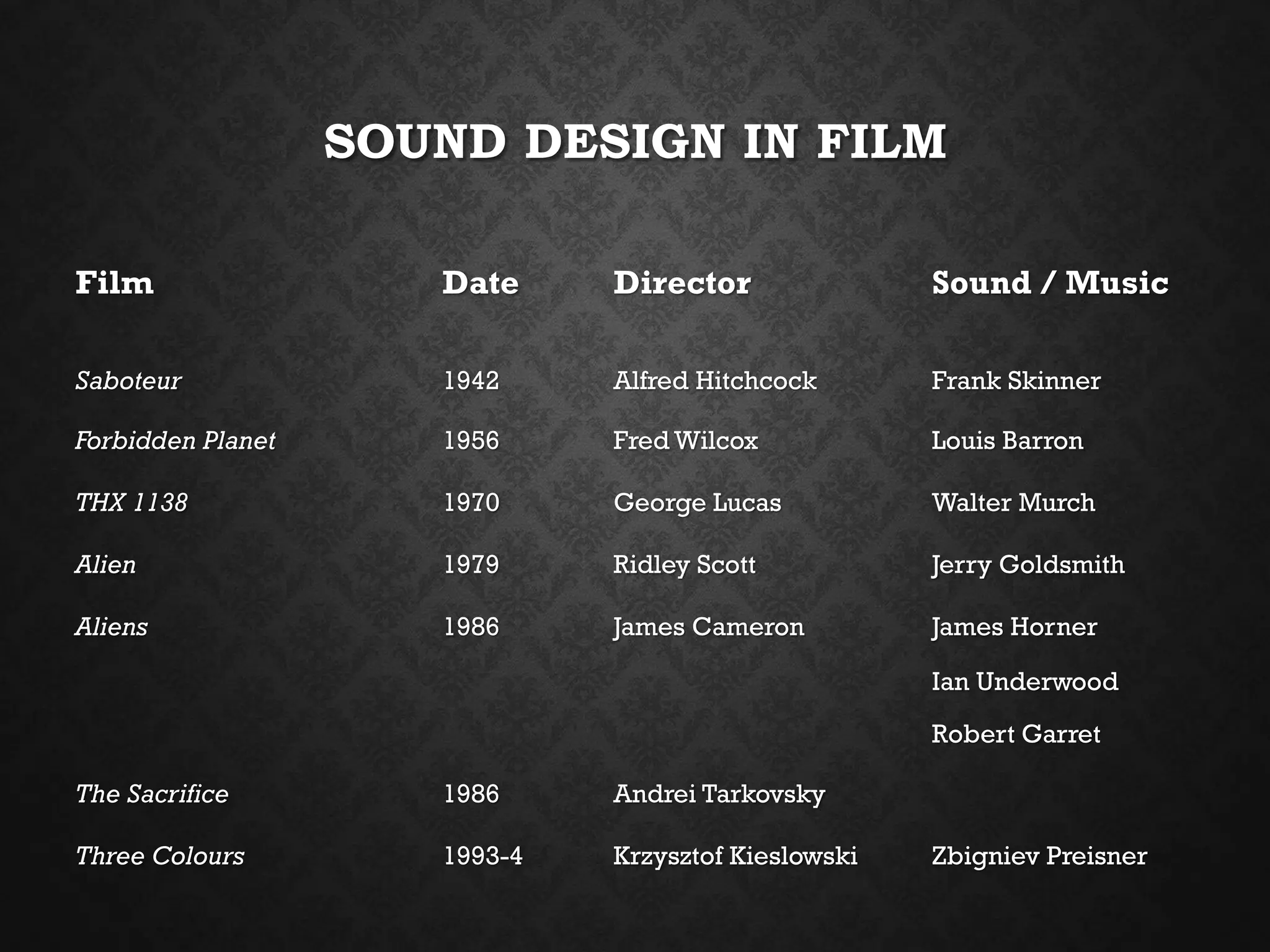 This document discusses sound design in several films from 1942 to 1994. It provides examples of how different directors have used sound effects, music, and their combinations to create atmosphere and perspective. Some key points made are that sound can be used to situate the viewer, blur boundaries between music and effects, and create a sense of reality or alienation. Films discussed include Alien, Aliens, Forbidden Planet, THX 1138, and The Sacrifice.