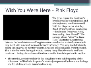 The document discusses potential non-diegetic music inspirations for a film from three Pink Floyd songs and "Chapel of Love" by The Dixie Cups. It describes how "Wish You Were Here" could inspire a tone of mental detachment and distance. "Prelude (The Wall Work in Progress)" could help build emotion and pace over the film. "Chapel of Love" could be manipulated to be haunting and enhance a narrative of looking back on emotional events despite its romantic tone. The document examines how each song could inspire certain feelings or narrative elements in the film.