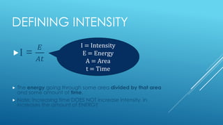 This document defines sound intensity and decibels. It explains that intensity is the rate of energy transfer per unit area, measured in watts per square meter. The range of human hearing spans from 1x10^-12 W/m2 to 1 W/m2. However, decibels provide a more efficient scale since they are logarithmic units that allow comparison to a reference intensity. The document provides formulas to convert between intensity (I) and decibel (dB) measurements.