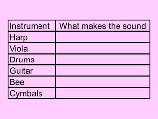 1) The document discusses how different objects produce sound through vibration and how sound waves travel through air to reach our ears.