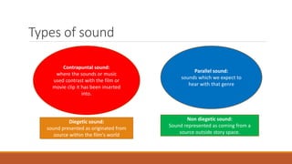 This document discusses different types of sound that can be used in films, including contrapuntal sound, parallel sound, diegetic sound, and non-diegetic sound. It provides examples of how the opening music of Jaws creates suspense using parallel sound, but how that suspense is transformed when different music is overlaid in a contrapuntal way. A variety of sound effects that could be used for a thriller genre film are also listed, including glass smashing, footsteps, and heartbeats. The document evaluates how sound is particularly important for thrillers to create emotions in viewers and illustrates actions through parallel sound or creates an eerie tone with contrapuntal sound.