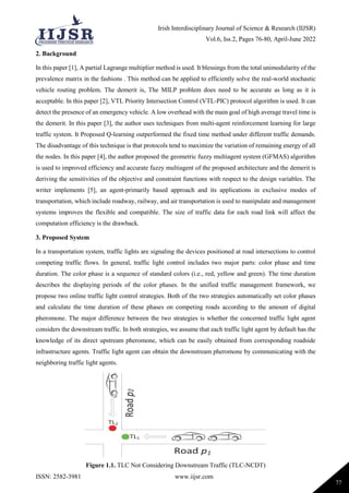 The document presents a sound sensor-based emergency vehicle preemption system using microcontrolled nodes to improve ambulance travel time through congested traffic. It outlines the implementation of an automated ambulance rescue system (AARS) that manipulates traffic lights based on the frequency of approaching ambulances. The proposed framework integrates vehicle rerouting with traffic light control, employing a multiagent pheromone-based strategy for traffic management and congestion alleviation.