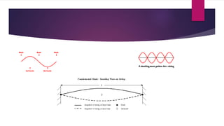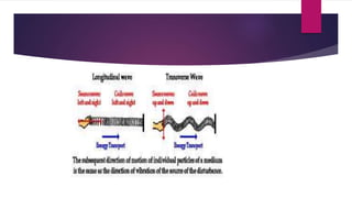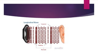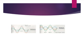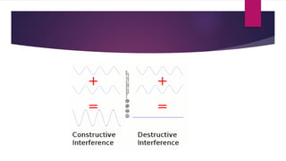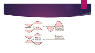 Sound waves are longitudinal mechanical waves that require a medium such as air or water to propagate. There are two types of mechanical waves: longitudinal waves where particles of the medium move parallel to the wave direction, and transverse waves where particles move perpendicular. Interference occurs when sound waves from different sources meet and combine to produce a new wave. Constructive interference amplifies the waves while destructive interference cancels them out. Infrasonic waves have frequencies below 20 Hz and ultrasonic waves are above 20,000 Hz, the normal human hearing range. Both have applications like monitoring earthquakes and welding.