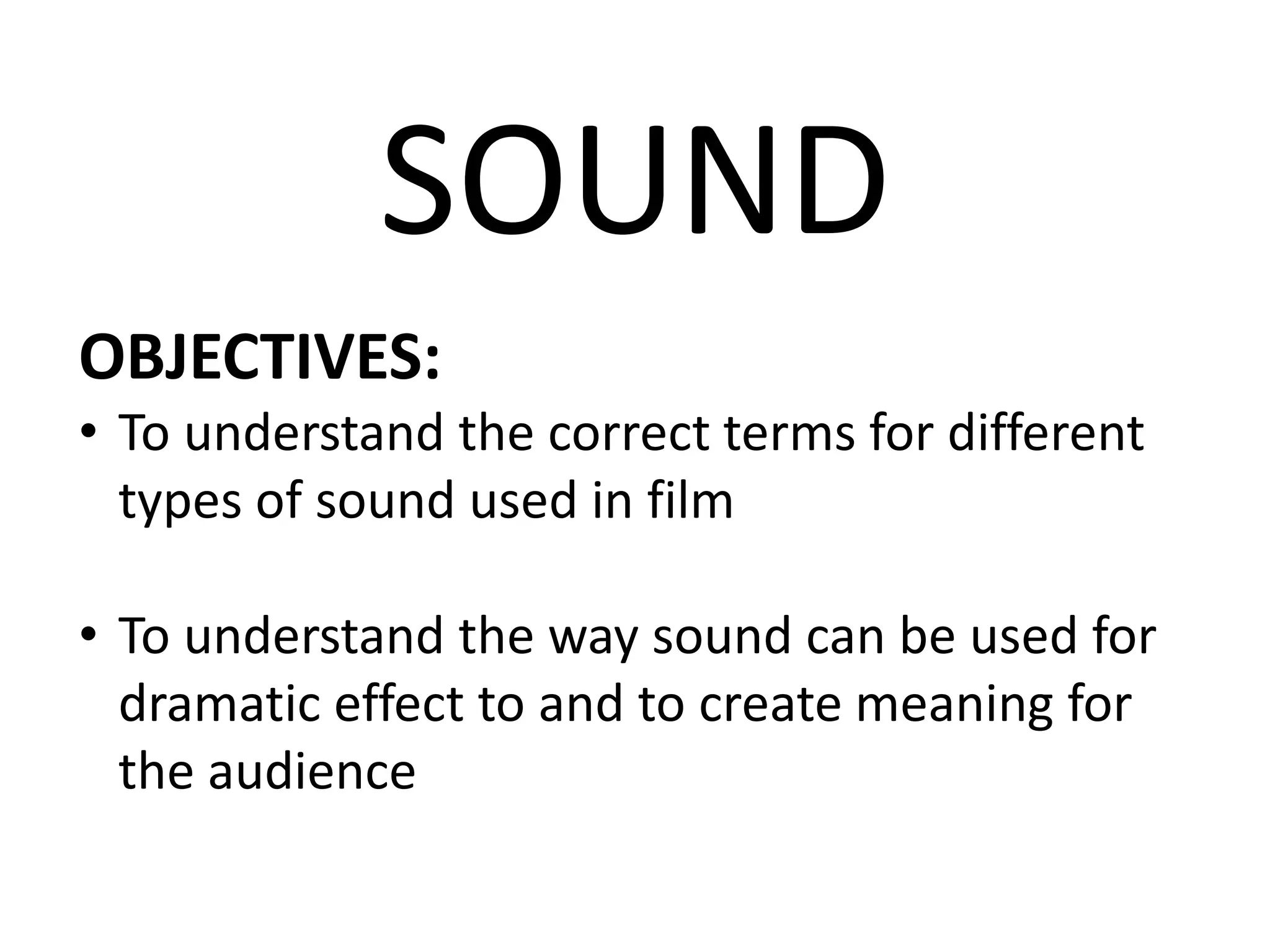 The document discusses different types of sounds used in film and their dramatic effects. It defines diegetic sound as coming from within the scene, like dialogue or ambient noise, while non-diegetic sound is added in post-production, such as music and sound effects. Specific techniques are described: crescendos build sound or music to imply something is happening; diminuendos allow music or sound to die down to suggest a threat is gone; and sforzandos use short, sharp noises to emphasize shock or fear. The document also discusses sound motifs that associate sounds or music with characters to convey meaning to the audience.