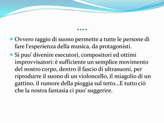 Il soundbeam è uno strumento che consente a chiunque di creare musica attraverso il movimento corporeo all'interno di un fascio di ultrasuoni, rendendo l'esperienza musicale accessibile anche a persone con disabilità. Funziona come un rilevatore di movimento, trasformando i movimenti in segnali midi per generare suoni variabili. È uno strumento creativo e coinvolgente per utenti di tutte le età e background musicali.