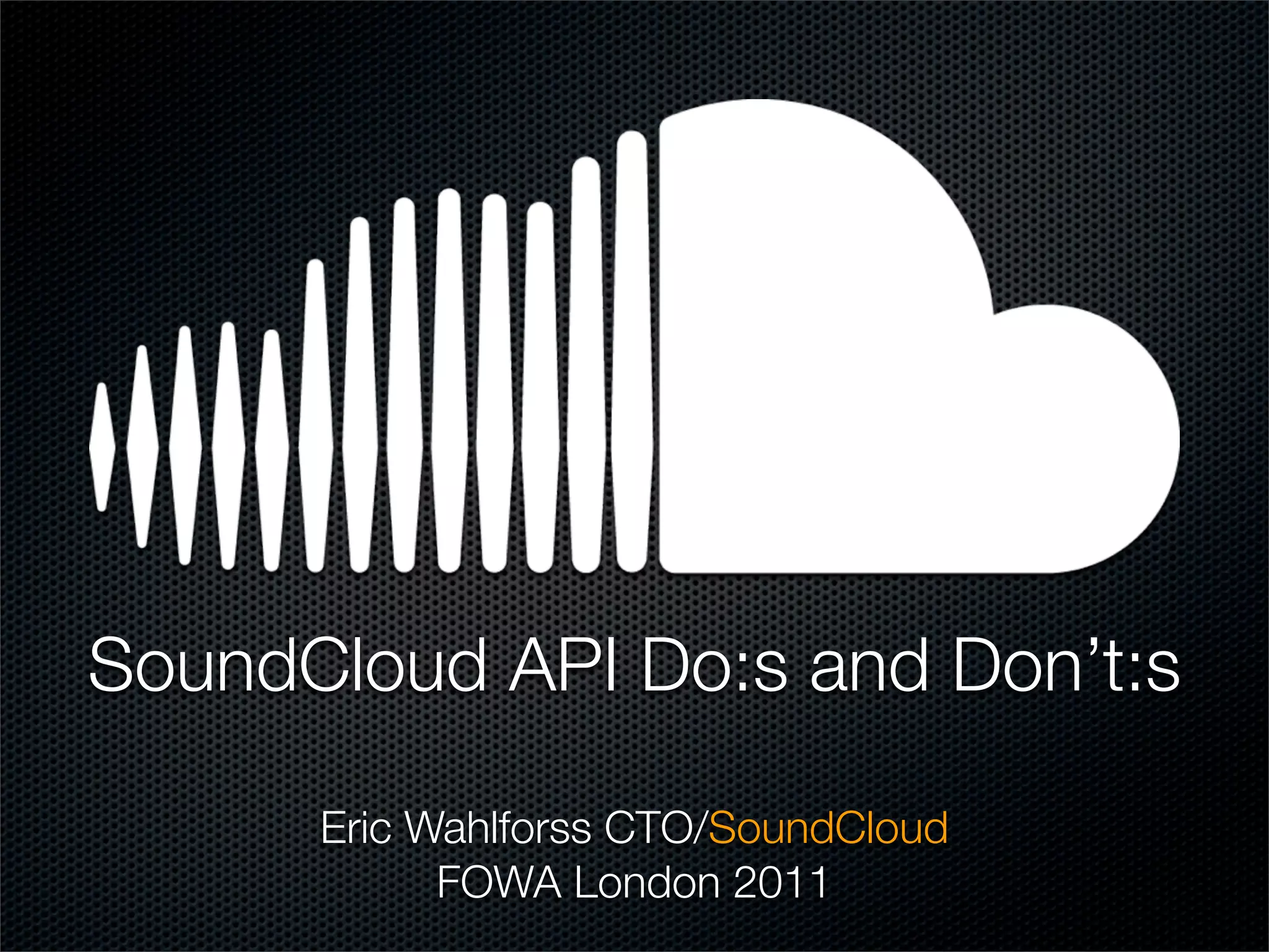 This document summarizes the key do's and don'ts for SoundCloud's API based on a presentation by Eric Wahlforss, CTO of SoundCloud. It recommends keeping the API simple, focusing on scalability and communication, engaging developers, and iterating quickly based on feedback and failures. SoundCloud aims to empower users through an open platform and has over 7 million creators and thousands of apps built using its API.