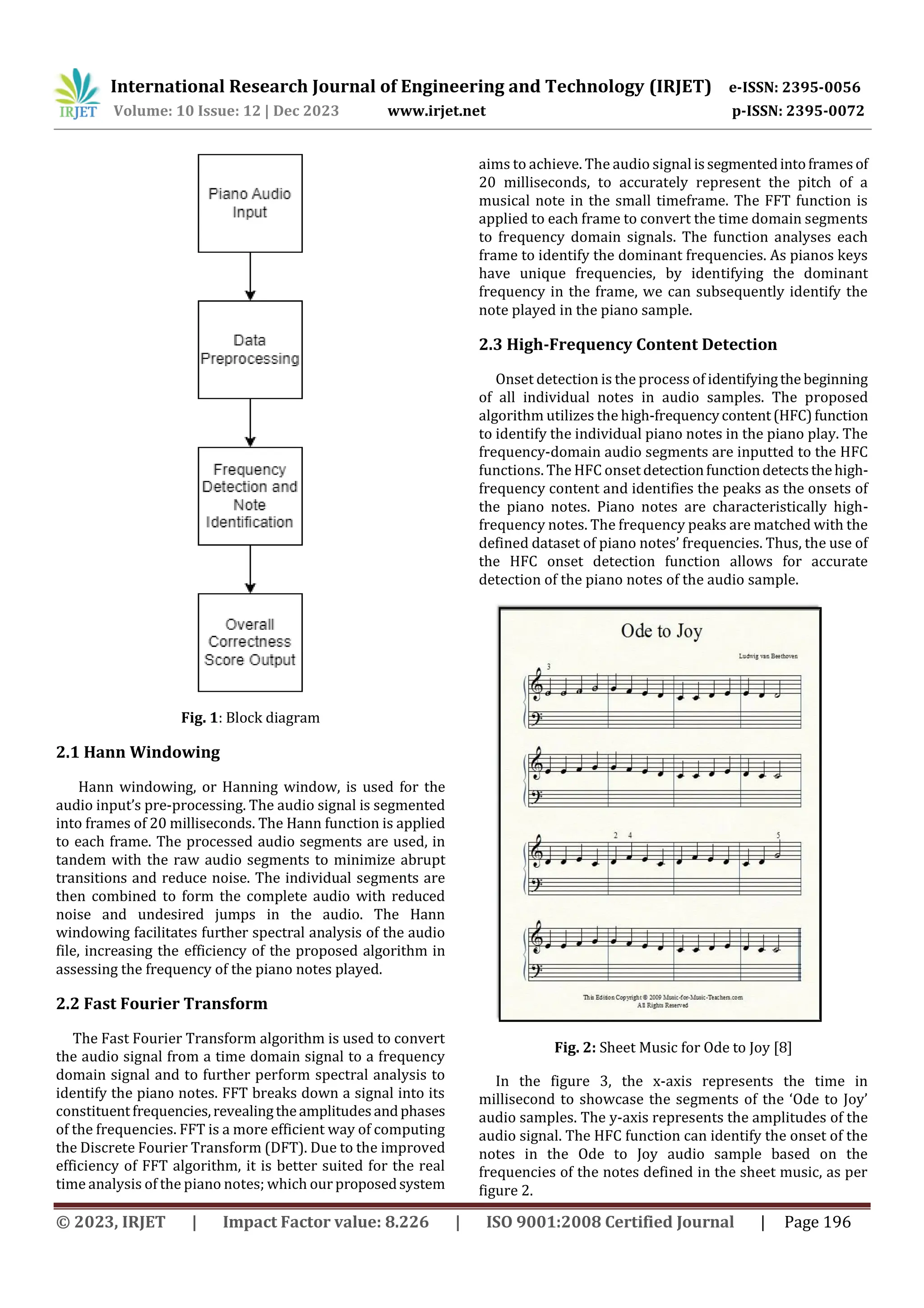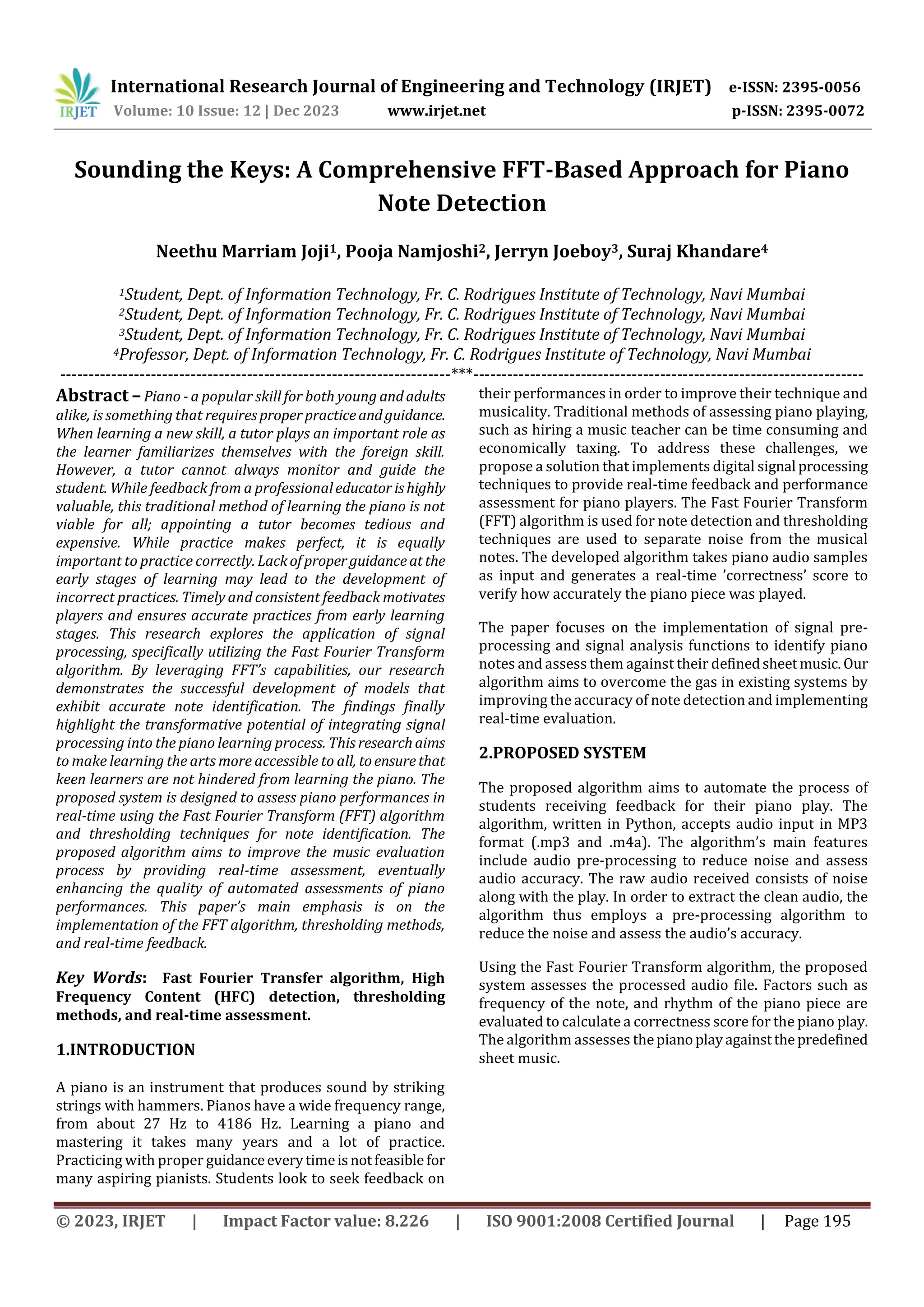 This document presents a system that uses digital signal processing techniques like the Fast Fourier Transform (FFT) algorithm and thresholding methods to provide real-time feedback and assessment of piano performances. The system takes an audio file of a piano performance as input. It uses FFT to convert the audio from time domain to frequency domain, allowing it to detect the frequencies of individual piano notes played. Thresholding methods are used to separate notes from noise. The system assesses the performance against sheet music to calculate a correctness score. It was tested on performances of "Ode to Joy" and showed high accuracy compared to human assessments, demonstrating the potential for such systems to make piano learning more accessible through automated feedback.