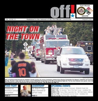 The document reports on the change of command at Fort Meade, where Col. Brian P. Foley officially takes over from Col. Edward C. Rothstein. It highlights upcoming community events and discusses Rothstein's farewell message, expressing gratitude for his tenure and focusing on community wellness and resilience. Foley aims to maintain existing initiatives and prioritize safety and community partnerships as part of his leadership philosophy.