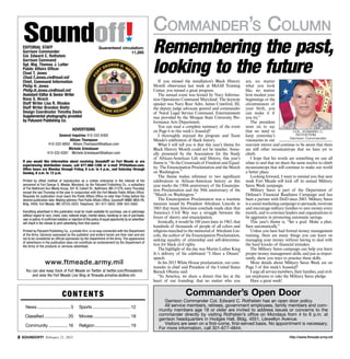 The document is a newspaper from Fort Meade covering local community events, including a wrestling tournament and upcoming karaoke and triathlon events. It also discusses the installation's recent Black History Month observance celebrating milestones like the Emancipation Proclamation and March on Washington. The Commander's column reflects on the importance of remembering the past while continuing progress towards equality and freedom.